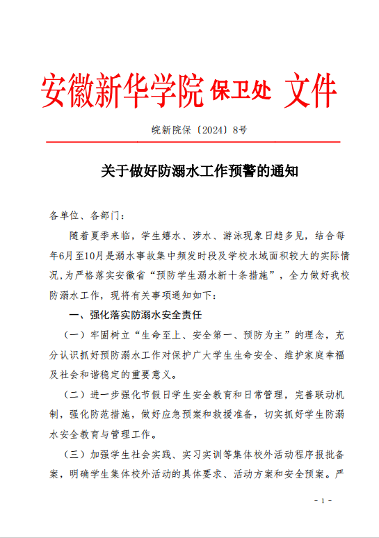 皖新院保〔2024〕8号 关于做好防溺水工作预警的通知