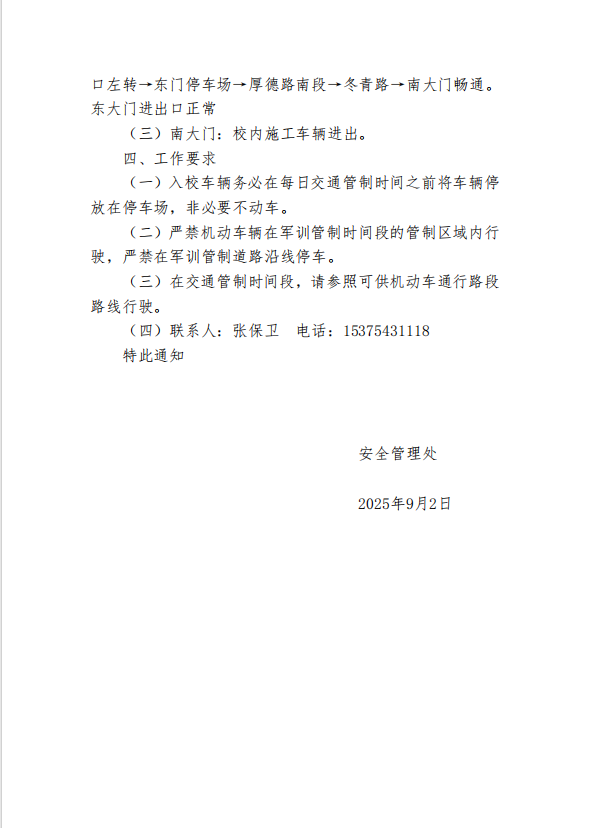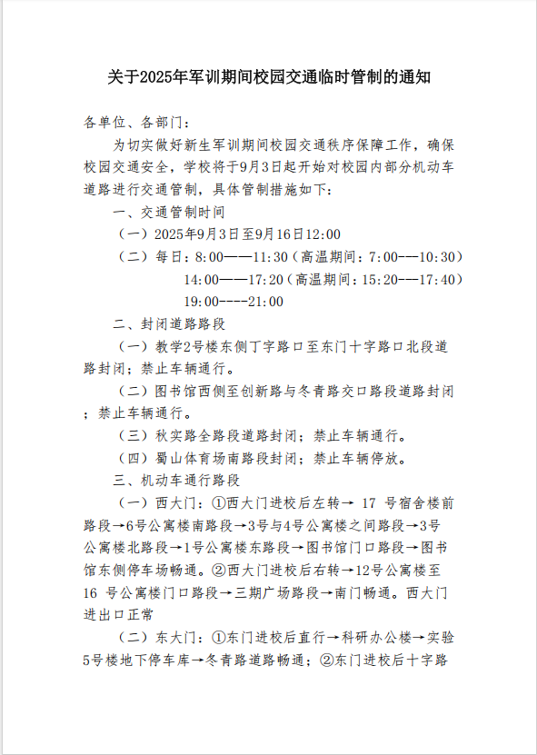 关于2025年军训期间校园交通临时管制的通知