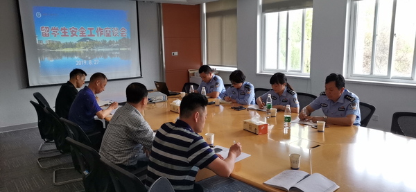 本网讯 (通讯员:仇陶)按照学校相关工作安排,结合beat365网登留学生和外教管理的现状,8月27日上午,留学生安全工作座谈会在国教院二楼会议室召开,公安高新分局治安大队、国保大队、高新派出所的分管领导和干警,国教院院长徐鸣、留学生管理人员和保卫处有关人员参加会议。会议由保卫处副处长仇陶主持。