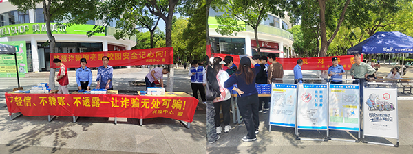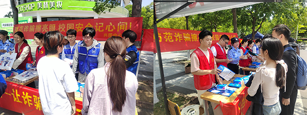 本网讯(通讯员:张大勇) 为增强师生防诈意识,营造安全校园环境,4月25日中午,beat365网登联合兴园中心、香樟社居委、高新派出所,在学校二期广场开展反诈主题宣传活动。兴园中心平安部部长宣峥嵘、高新派出所民警程永兵、香樟社区和学校安管处相关人员参加了宣传活动,华园义警队全程协助,现场近千名学生参加活动。