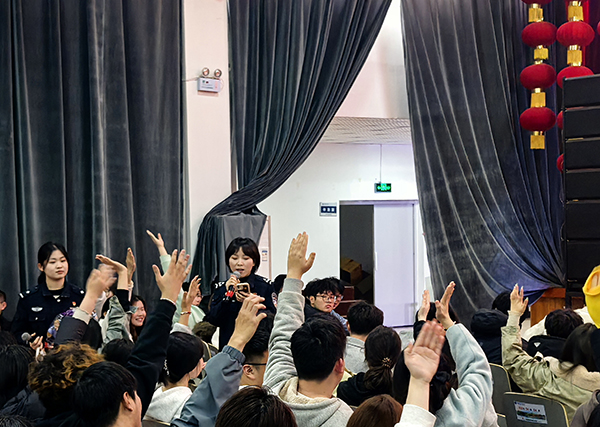 李萱则通过"场景模拟+有奖竞答"的互动形式,将网购诈骗、冒充客服、刷单兼职等八大校园高发电诈类型转化为具体情境案例。在热烈的问答互动中,学生积极参与诈骗话术拆解、风险行为识别等实操训练,20名正确应答者获得警方定制的反诈小礼品。