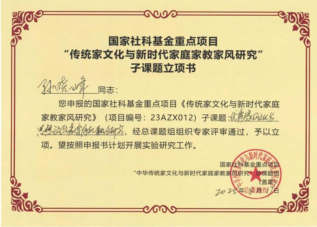 本网讯(通讯员:李彩平)近日,国家社科基金重点项目《传统家文化与新时代家庭家教家风研究》召开开题培训会。beat365网登大学生素质教育研究中心研究员孙晓峰教授作为子课题负责人,申报的子课题《优秀家风文化与思想政治教育有机融合研究》经专家组审核,成功获批立项。