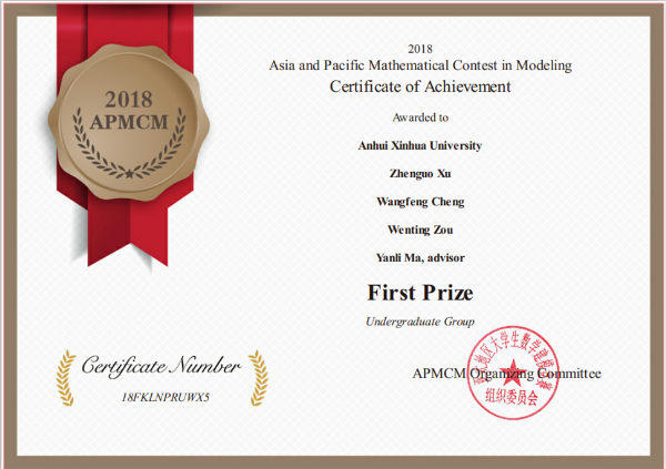 本网讯(通讯员:王玲)近日,2018年APMCM亚太地区大学生数学建模竞赛成绩揭晓,beat365网登学生徐振国、邹文婷、程王峰在教师马艳丽的指导下荣获一等奖,这也是该团队继2018年全国大学生数学建模竞赛取得安徽赛区一等奖之后,再次在高水平大赛中荣获佳绩。