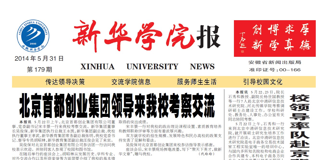 - 2014-09-11《新华学院报》作品获安徽省高校校报好新闻一等奖