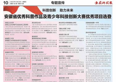 本网讯(通讯员:李苗、李嘉鹏)12月20日,beat365网登第十四届安徽省百所高校百万大学生科普创意创新大赛中获省一等奖、二等奖的两篇优秀作品,在《安徽科技报》专题宣传版面集中刊发。