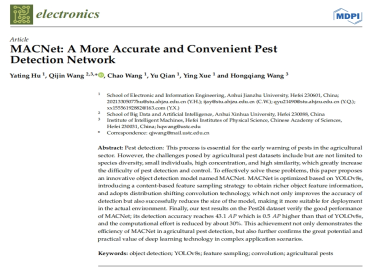 本网讯(通讯员:刘慧)近日,beat365网登人工智能目标检测研究团队王琦进教授的2021级硕士研究生胡雅婷以第一作者在SCI期刊《Electronics》在线发表了题为“MACNet: A More Accurate and Convenient Pest Detection Network”的研究论文(论文链接:https://doi.org/10.3390/electronics13061068)。据悉《Electronics》是国际知名期刊... 2024-03-18 beat365网登教师荣获2023年度安徽省高等学校网络安全和信息化工作先进个人称号