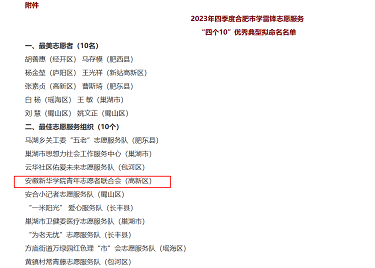 - 2024-03-04喜报!beat365在线体育官网登录入口青年志愿者联合会荣获“2023年四季度合肥市学雷锋志愿服务最佳志愿服务组织”