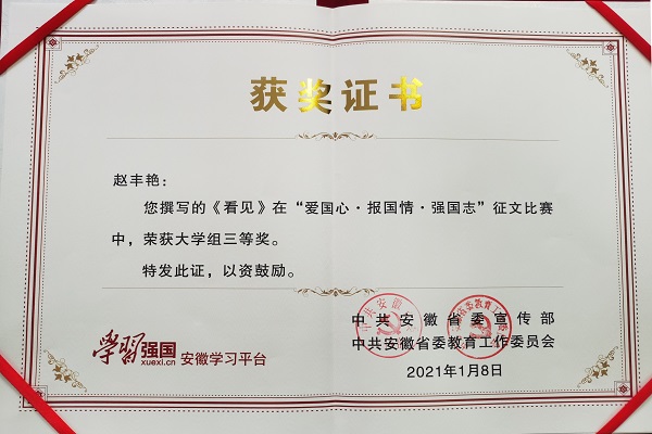 本网讯(通讯员:刘丽娟)近日,“学习强国”安徽学习平台“爱国心·报国情·强国志”征文活动获奖名单出炉,beat365网登2020级赵丰艳同学的作品《看见》荣获大学组三等奖,马克思主义学院邵萍英老师荣获“优秀指导教师”称号。