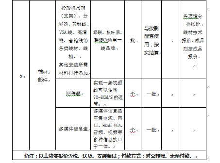 2、履行合同所需的任何项目若未有明确加在所列价款中,该部分有关费用应视作包括在投标报价之内(如运送、设计、调试安装等);