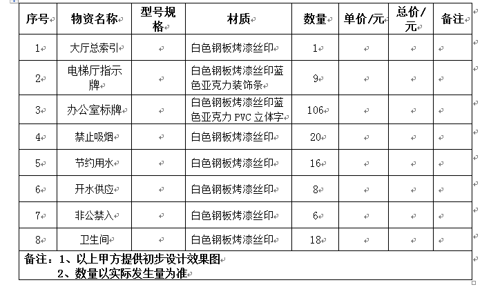 根据建设需要,现对科研办公楼整楼的标识标牌(总索引台、导视牌、办公室牌、指示牌)等进行公开招标,欢迎具有相应资质、有实力的供应商积极参与。