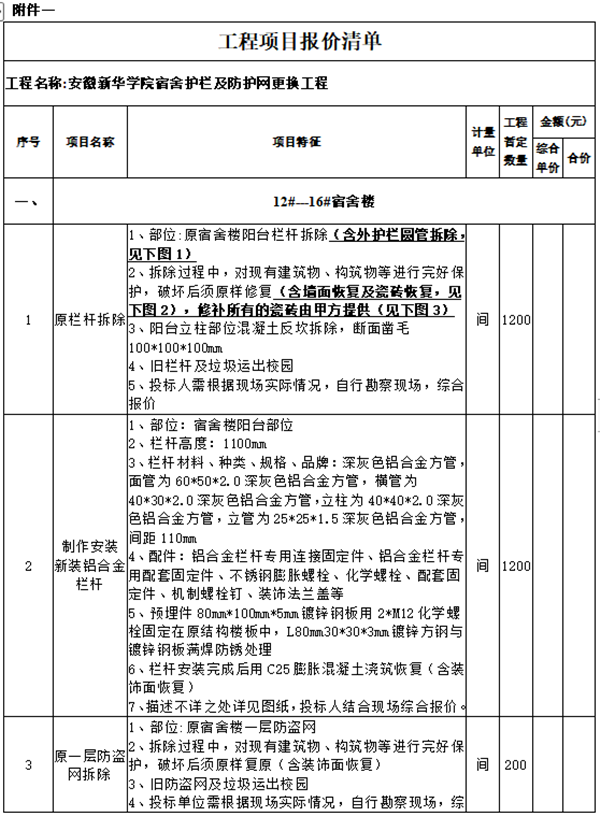 1.项目名称:宿舍楼护栏拆除及更换项目