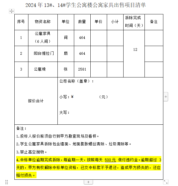 13#、14#学生公寓楼公寓家具出售项目清单 详见附件一