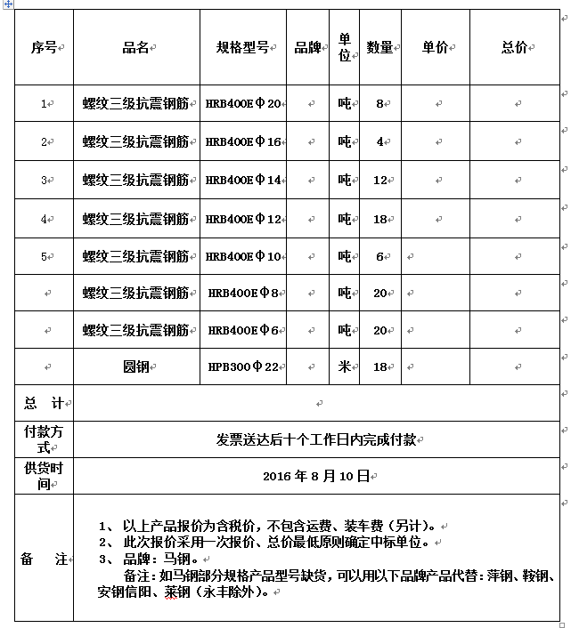 2.须注明各自产品单价和总价、付款方式、最快供货时间、装货费用及运输费用等。