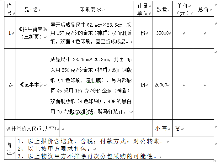2、报价表(必须密封):报出每种规格印刷品的单价和总价及合计总价(含税、送货上门价);