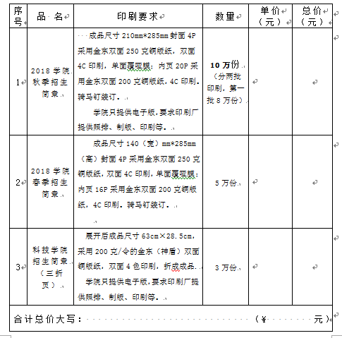 1、报价表(必须密封):报出每种规格印刷品的单价和总价及合计总价(含税、送货上门价);