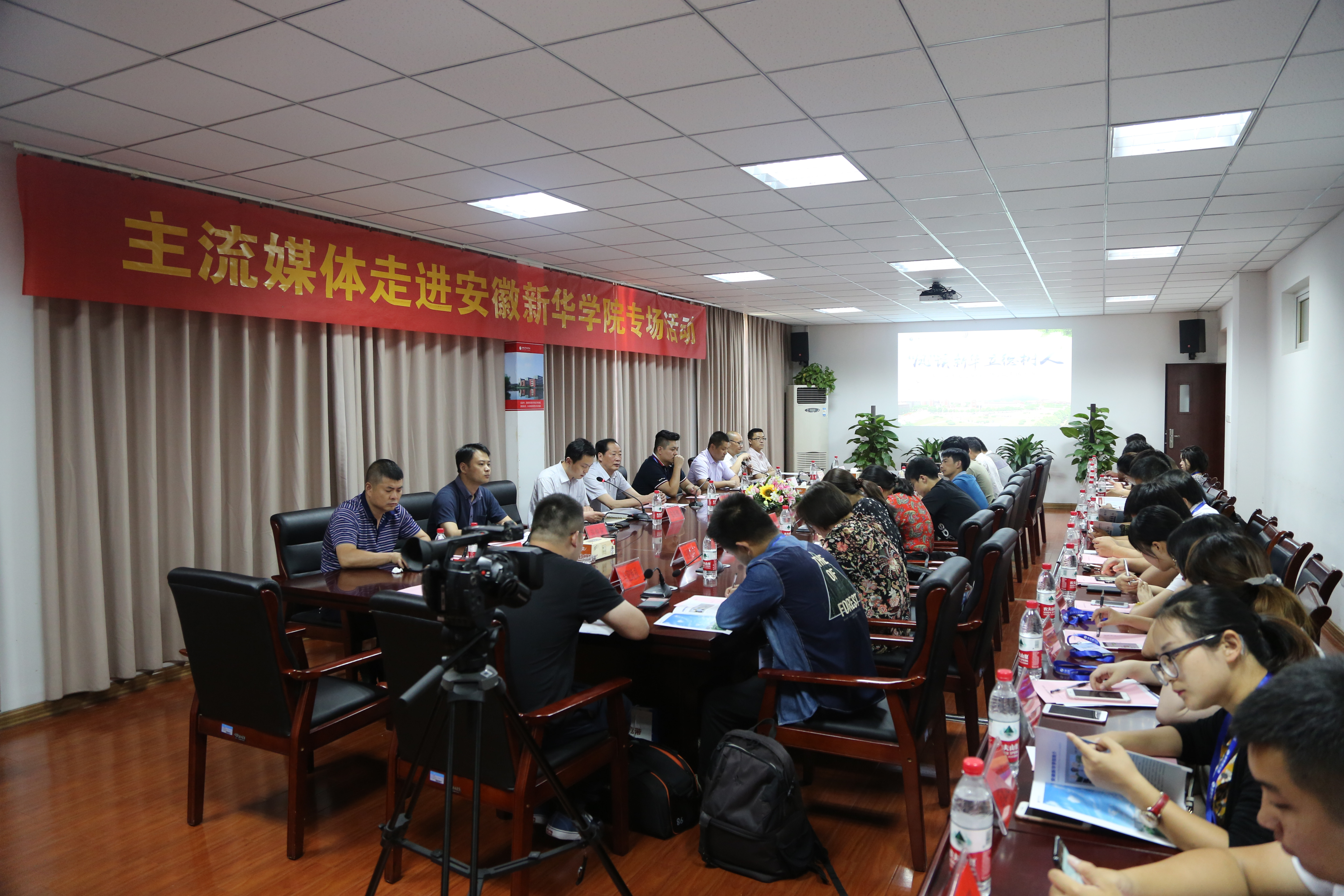 省督导专员、学校党委书记储国定,副校长朱兆健,校宣传处、教务处、科研处、学生处、保卫处、总务处、产业处相关负责人,凤凰网安徽副总经理张建斌和凤凰网安徽营销中心副总经理谢长城以及30余家主流媒体大咖共同出席了此次活动。本次活动由宣传处处长管玉中主持。