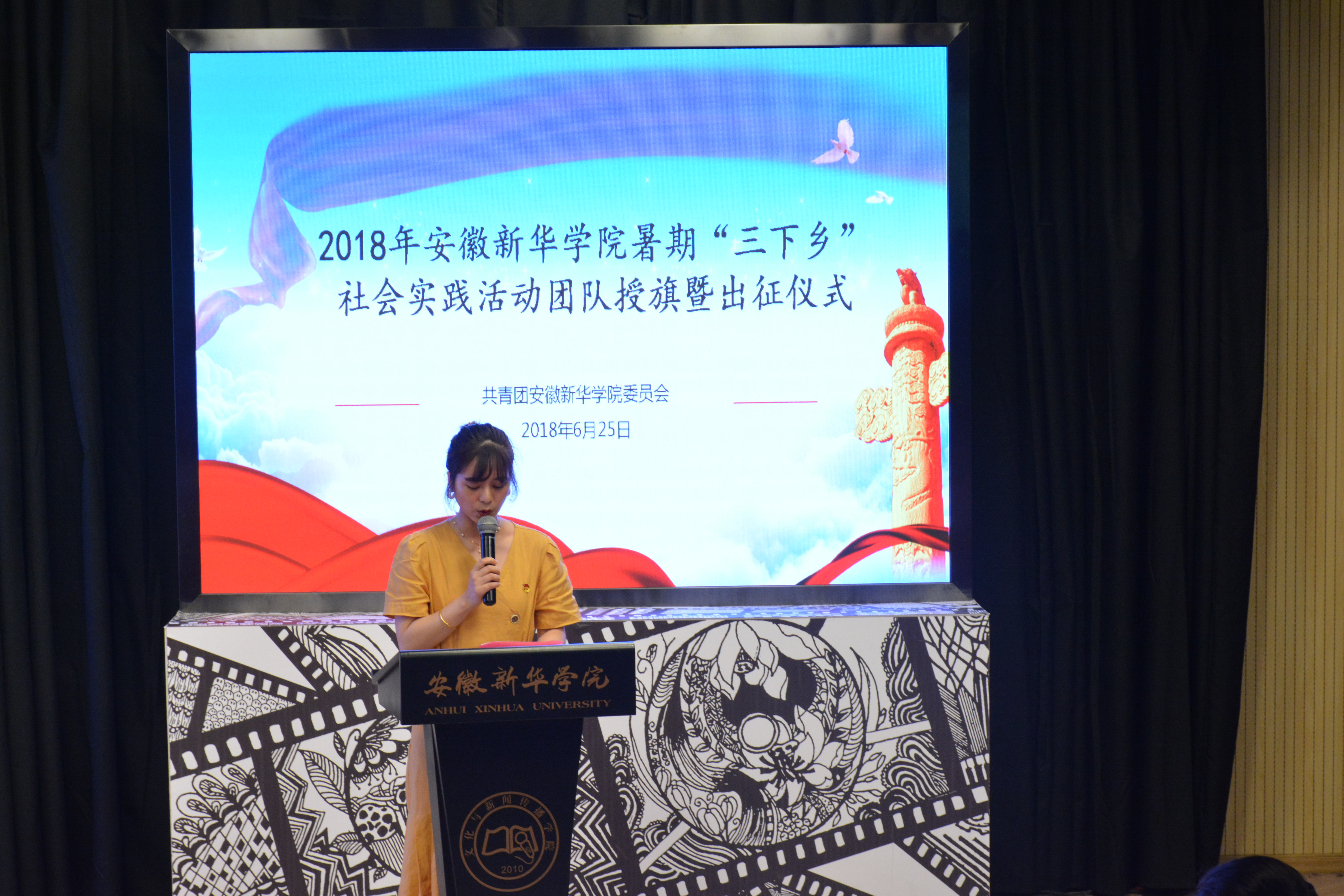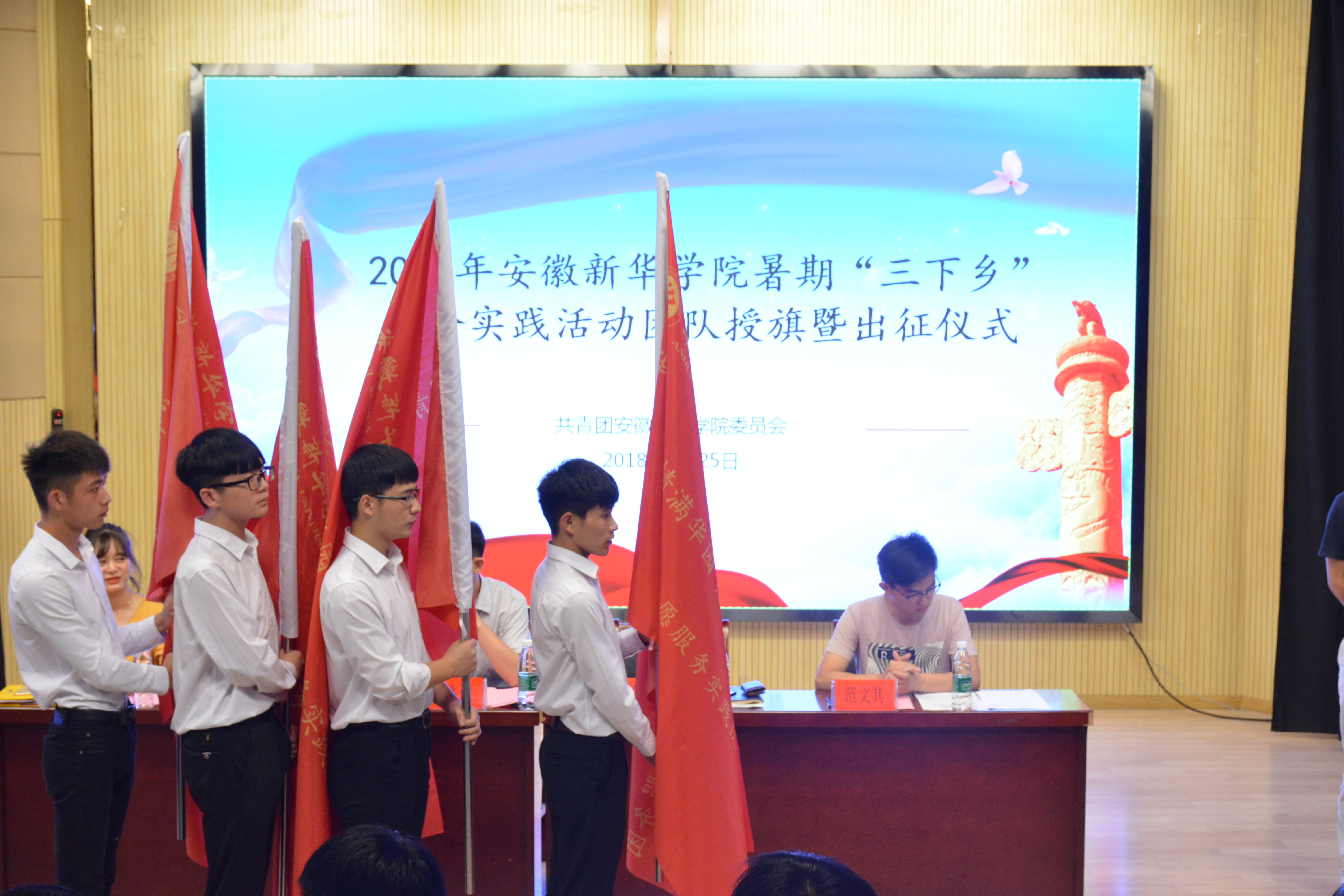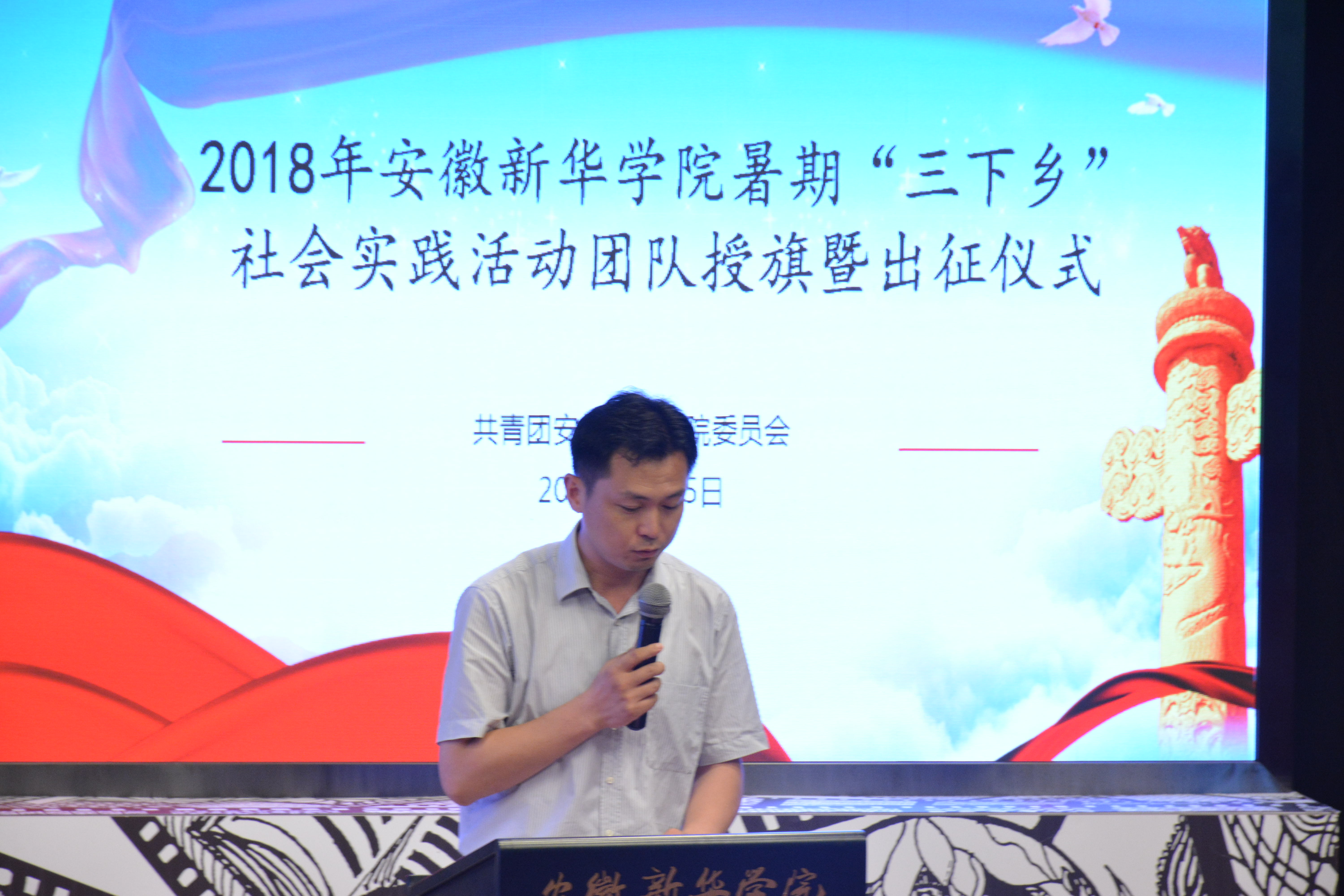 本网讯(通讯员:杨雨婷)为更好地深入贯彻习近平新时代中国特色社会主义思想,引领教育广大青年学生勇做担当民族复兴大任的新时代生力军,培育自觉为人民服务的责任意识,以实际行动助力精准扶贫乡村振兴战略,切实感受改革开放40年取得的新成就新面貌,恰逢中国共产主义青年团第十八次全国代表大会即将召开的重要时期,beat365网登于6月25日上午10时在文传演播厅举办2018年文化科技卫生暑期社会实践活动(以下简称“三下乡”)授旗暨出征仪式,紧跟党、紧跟习近平总书记,意气风发迈上新征程。出席本次会议的有校党委委员、副校长朱兆健,党委学工部部长、学生处长汪俊东,校团委副书记柯姗姗,党委宣传部、宣传处处长助理范文其以及各二级学院副院长、团总支书记。本次会议由柯姗姗主持。