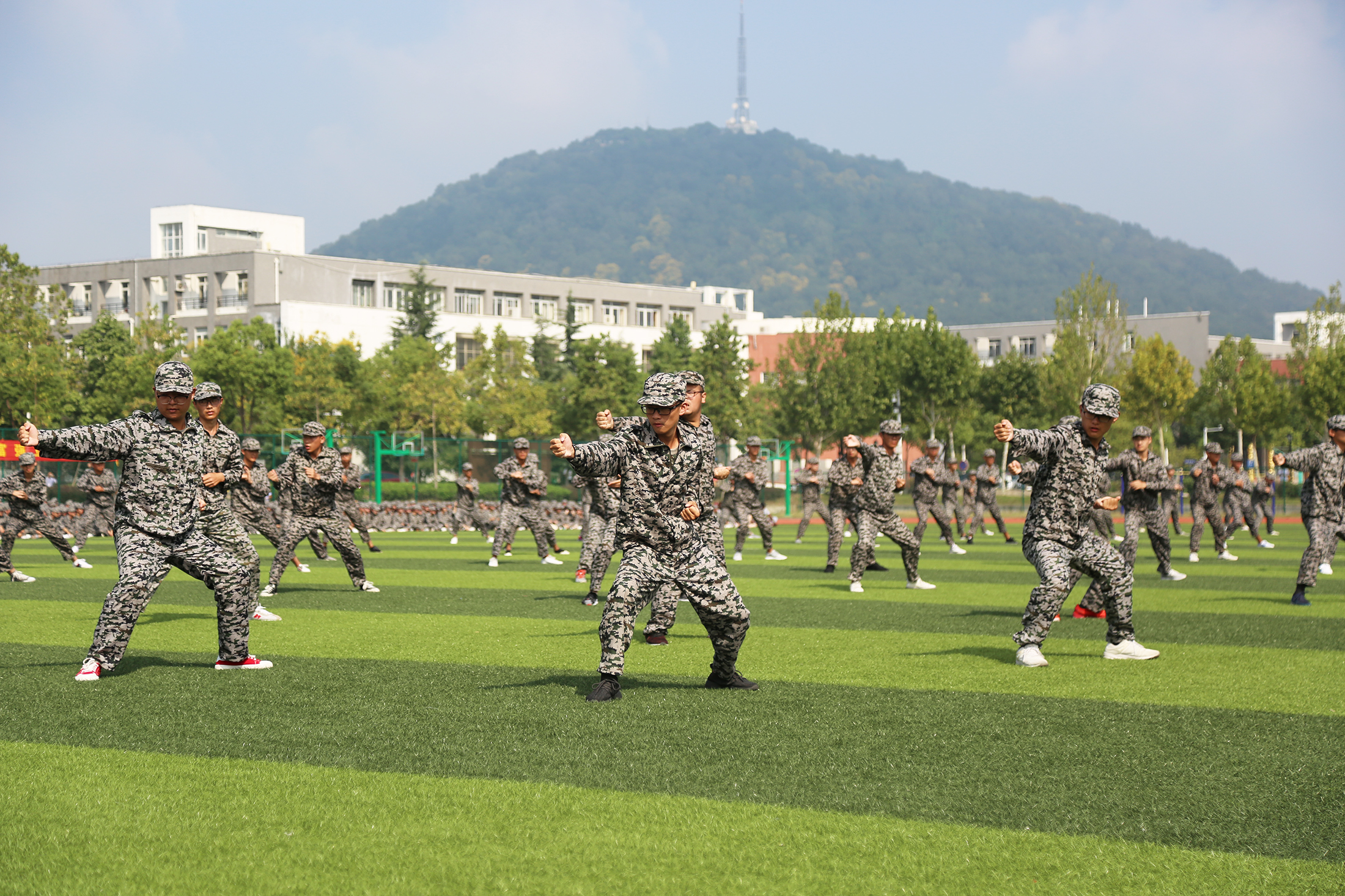 分列式表演结束后,11个二级学院共同参与的4个学生方队进行了军体拳、韵律操、队列展示、军歌合唱训练成果汇报。
