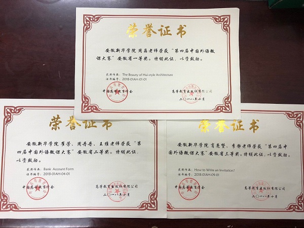 本报讯(通讯员:李静、周晶)10月19日,外语微课资源建设与应用研讨会暨第四届中国外语微课大赛颁奖仪式在成都新国际会展中心举办。beat365网登外国语学院教师周晶,崔芳、周丹丹、王维团队,肖亮赞、李静团队分别荣获省一等奖、二等奖及三等奖。周晶作品“The Beauty of Hui-style Architecture(徽派建筑的美)”荣获大赛全国优秀奖。