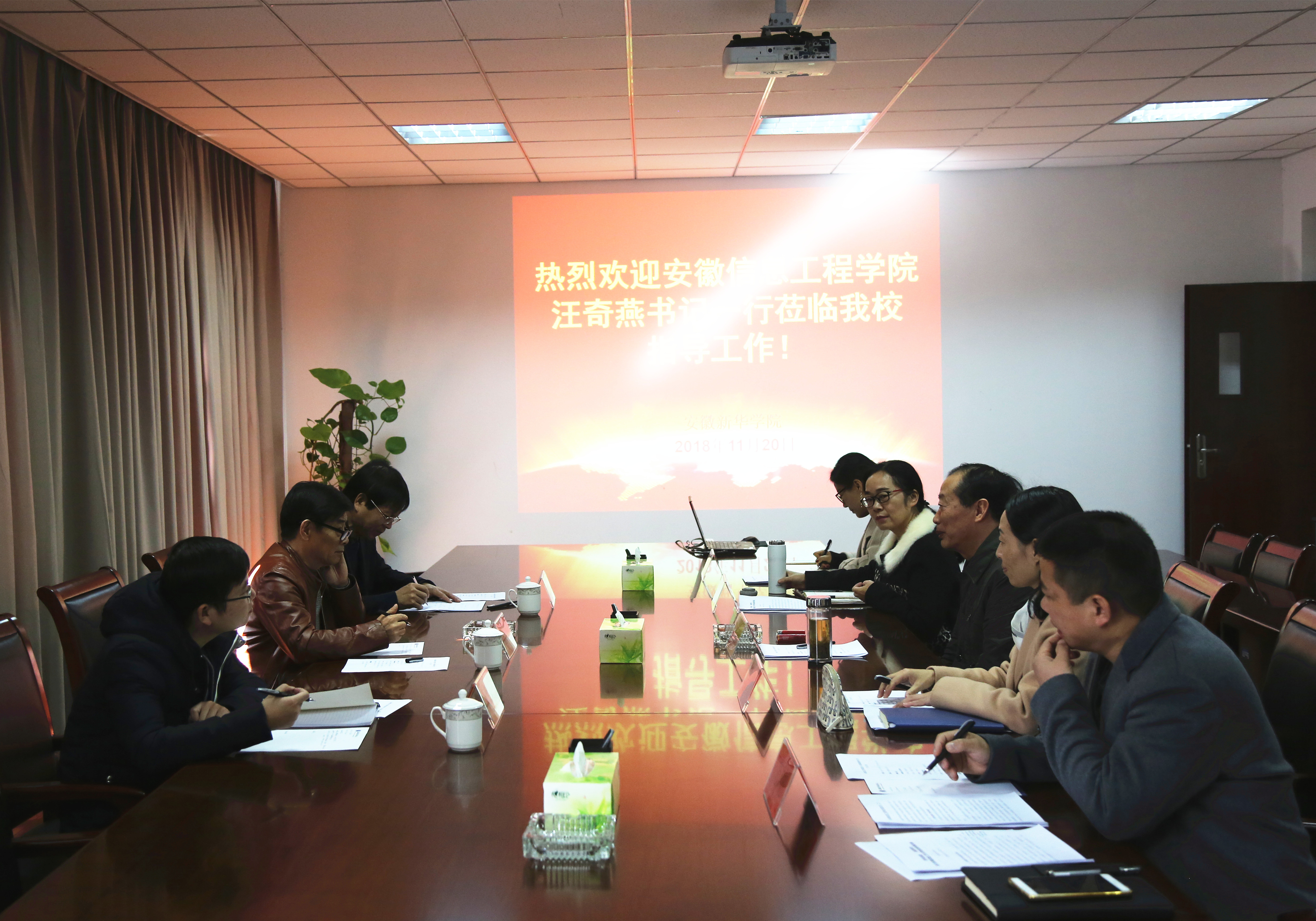 本网讯(通讯员:程海青)11月20日上午,安徽信息工程学院党委书记汪奇燕、党委办公室主任袁龙喜、党务专员阚海峰一行来beat365网登就党建工作和学校发展进行考察交流。省督导专员、校党委书记储国定,常务副校长王丽,学校办公室(发展规划处)主任盛晓青及党委组织部相关人员等参与接待。