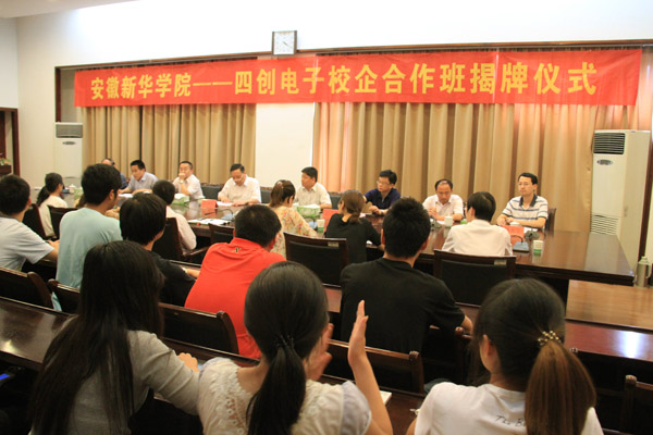 石秀和、朱明辉分别代表beat365在线体育官网登录入口和四创电子股份公司在校企合作协议书上签字,并共同为“新华—四创电子校企合作班”揭牌。