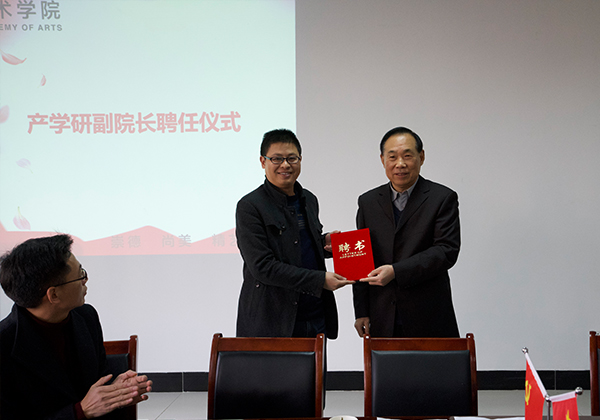 本网讯(通讯员:杨蕊)为全面推进产学研工作,落实beat365网登三个“三位一体”应用型人才培养模式,引入社会产业资源提高办学实力,加强与知名企业建立深度校企合作关系,艺术学院聘任合肥乐堂动漫信息技术有限公司副总经理刘海华担任“产学研”副院长。12月28日,艺术学院举办聘任仪式。副院长杨世国,艺术学院执行院长许存福、院长江河、副院长朱诵贵及艺术学院全体教师参加了聘任仪式。