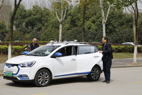 杨世国、黄仿伦试乘了无人驾驶汽车,在行驶过程中,车辆沿校园环线道行驶平稳,转弯等动作流畅,对行驶中的车辆和移动中的行人等障碍物多次成功避障。杨世国对团队的工作给予了高度认可,对取得的研究成果表示充分肯定,他建议,后期在无人扫地车、无人洒水车和无人巡逻车等方面继续进行关键技术研究,扩大应用范围,有效实现科学技术向实际生产的转化。他希望今后能继续探索无人驾驶车辆前沿技术,深入开展技术攻关,进一步加强与兄弟高校之间的联系,加大校企合作的力度,推进产学研多角度发展。