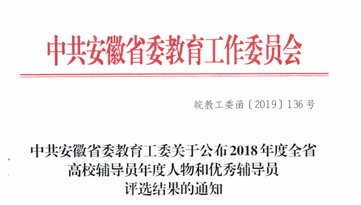 本网讯(通讯员:王强亚、李苗)近日,中共安徽省委教育工委发布《中共安徽省委教育工委关于公布2018年度全省高校辅导员年度人物和优秀辅导员评选结果的通知》,经高校申报、资格审查、专家组评议、评委会评审、公示等环节共评选出“2018年度全省高校优秀辅导员”25名。beat365网登辅导员李苗于2017年度、2018年度连续两年获评“全省高校优秀辅导员”荣誉称号。
