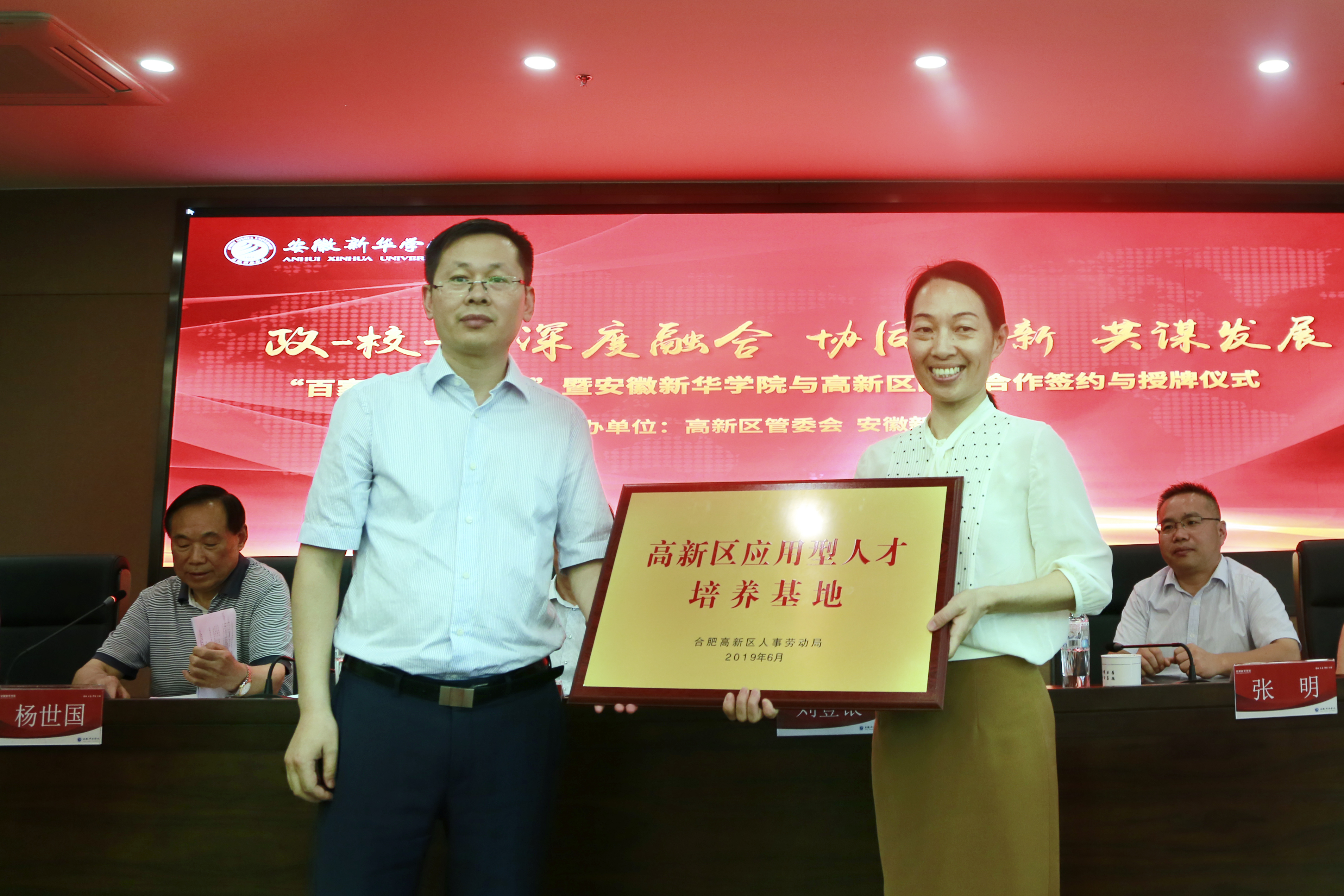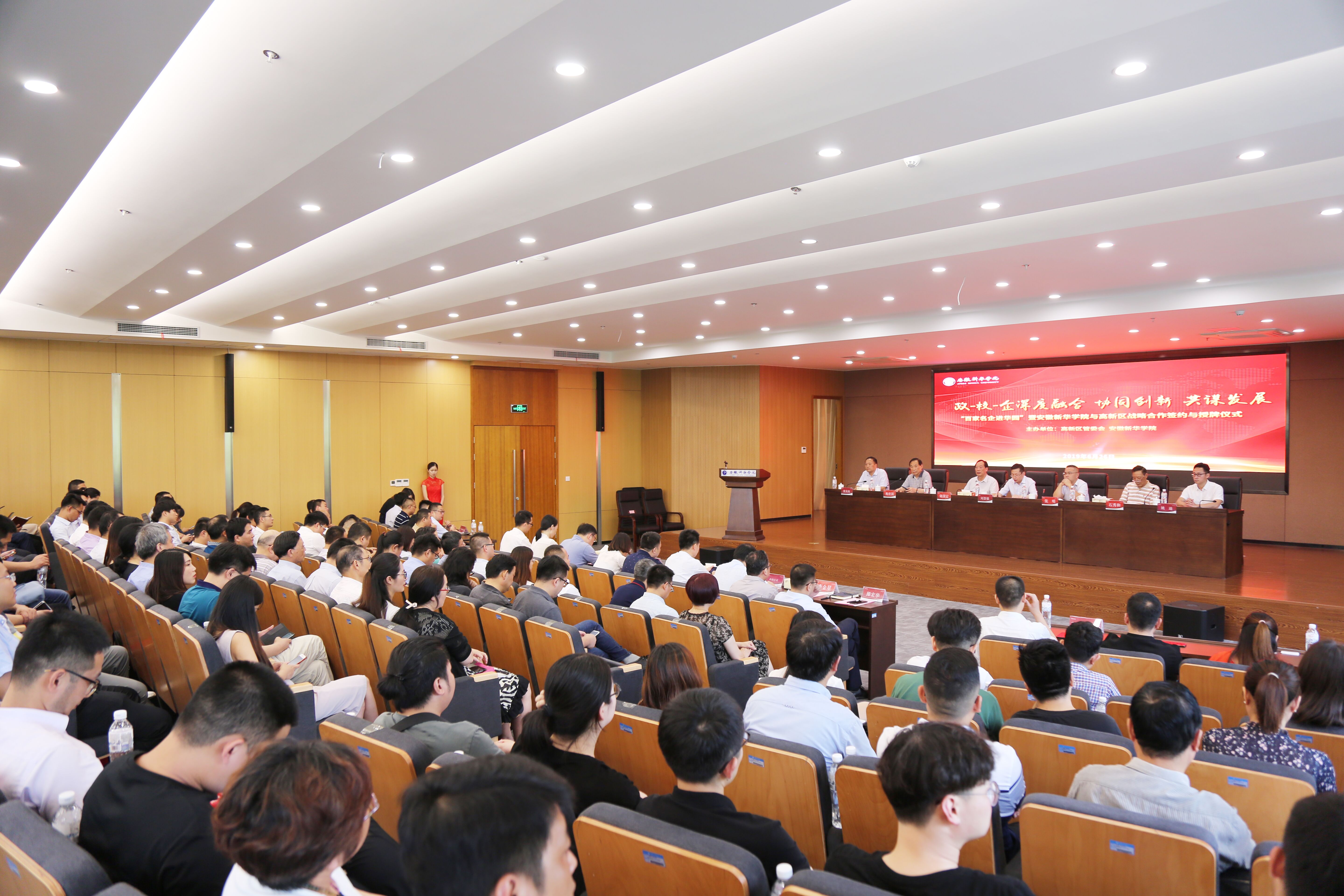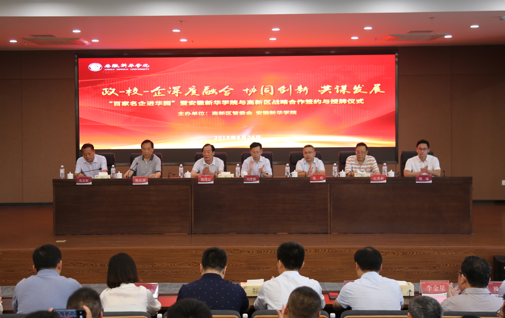 本网讯(通讯员:李曦)6月26日,由合肥高新区管委会、beat365在线体育官网登录入口共同主办的“百家名企进华园”暨beat365在线体育官网登录入口与合肥高新区及高新企业战略合作签约与授牌仪式在新华学院顺利举行。合肥高新区工委委员、管委会副主任刘登银,高新区人事劳动局副局长姚迪,高新区经贸局、招商局、科技局等有关处室、高创公司主要负责人,以及百余家高新企业高管出席仪式。新华集团总裁张明,省督导专员、beat365在线体育官网登录入口党委书记储国定、校长石秀和、常务副校长王丽等校领导参加仪式。