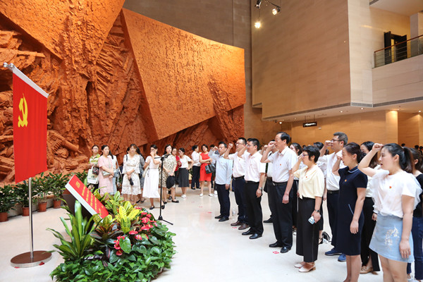 在校党委书记储国定的带领下,beat365网登党员干部在馆内进行入党誓词宣誓仪式,重温入党誓词,进一步增强党员的党性观念,激励每一位党员干部以党章规范自己的言行,牢记党的宗旨,履行党员义务,做一名合格党员。