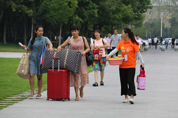 文化与新闻传播学院的曹博源是迎新大队中的一员,这是他第二次参加迎新活动,虽然天气炎热很辛苦,但能够看到新生们顺利地报到,看到他们和家长脸上露出笑容,便觉得自己再辛苦也是值得的。