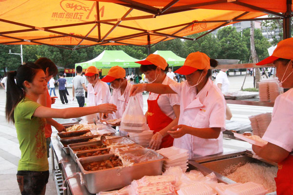 翰林食堂因要作为新生缴费的地点,所以餐桌都被规整地堆放在两边,地面看上去也是非常清洁。KK餐厅的韦经理说他在学校里已经经营了3年,迎接新生及家长也算是有一定的经验。为了迎接新生,食堂专门组织员工进行培训,以提高服务质量。在控制食堂饭菜量方面,这几天韦经理会先出去看看学生就餐的大概人数,然后确定饭菜的需求量,“尽量做到只多不少。”翰林食堂虽然不作为主要就餐点,但是会为购买饭票的新生和家长提供盒饭。9月2日,翰林食堂的工作人员早早地就将餐车推到广场上,为需要就餐的新生及家长提供午餐。