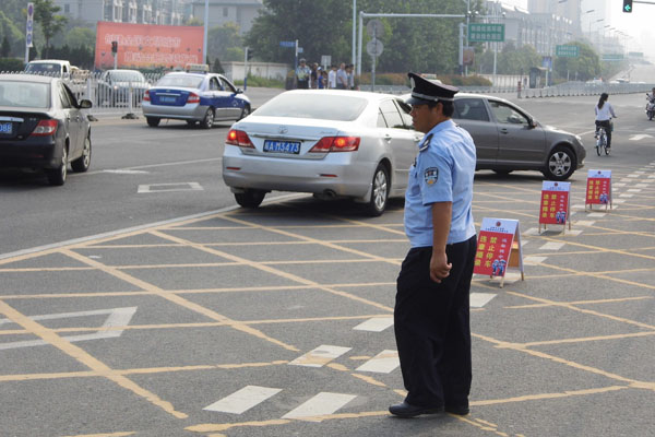 嘹亮的口哨声,标准的动作,行云流水地指挥着过马路的车辆、新生及新生家长,这是高新区交警在学校北大门丁字路口指挥交通。