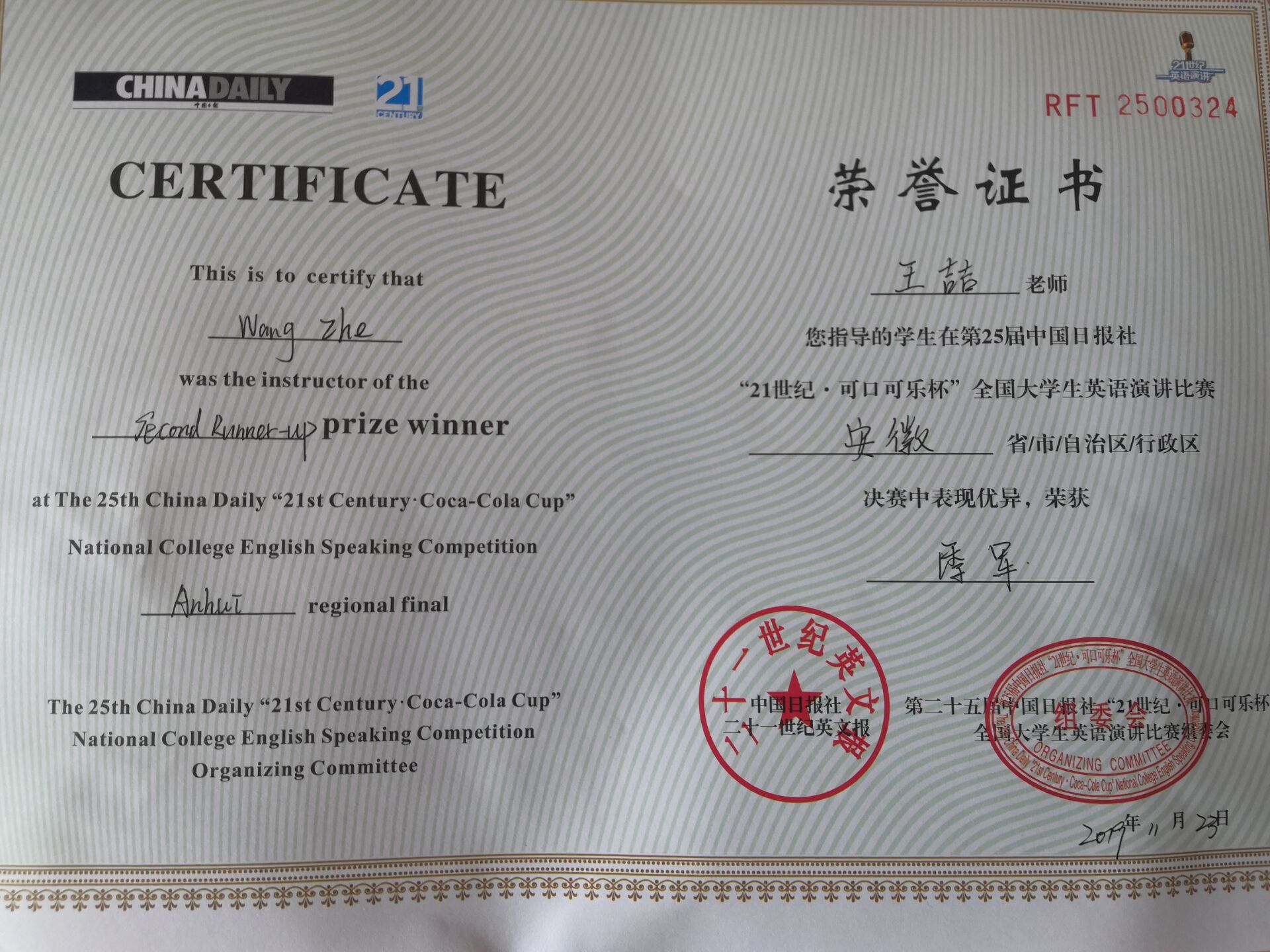 本网讯(通讯员:王喆)11月22-23日,由中国日报社与可口可乐中国联合举办、二十一世纪英语教育传媒承办的第25届中国日报社“21世纪杯全国大学生英语演讲大赛”安徽地区总决赛在南京中国药科大学举办,beat365在线体育官网登录入口选手李航同学,在学校外国语学院教师王喆的指导下,获得安徽省总决赛季军,并成功入围在京举办的全国半决赛。安徽省前三名分别是安徽师范大学,安徽大学、beat365在线体育官网登录入口。