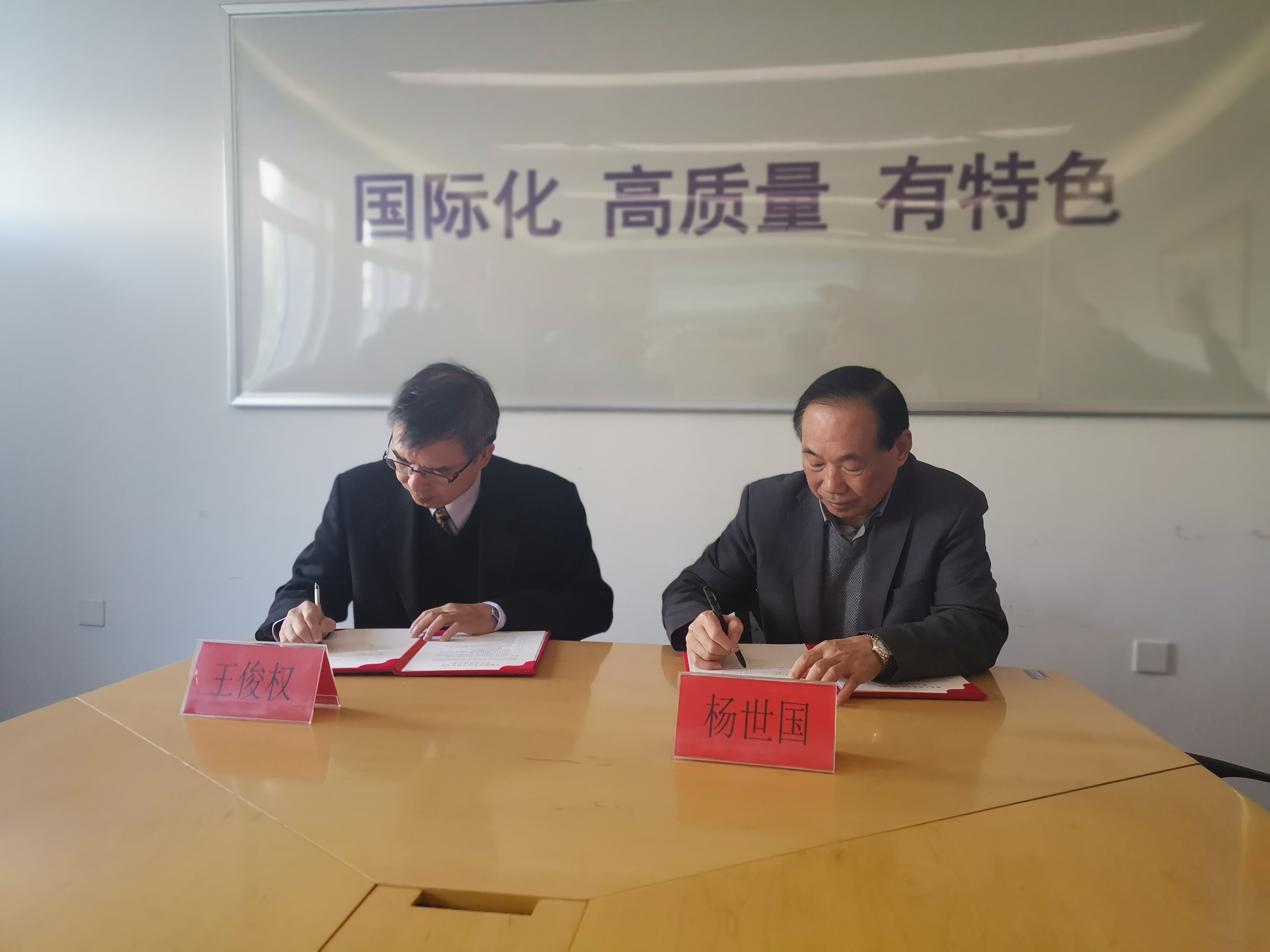 最后,杨世国和王俊权共同签署校际合作协议和学生交流协议,并互换校旗与礼品,合影留念。