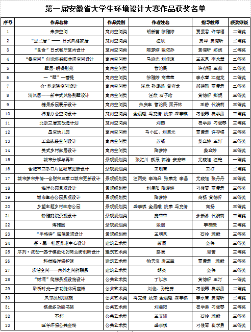 本网讯(通讯员:黄德昕)为了深入贯彻落实教育规划纲要和《国务院办公厅关于深化高等学校创新创业教育改革的实施意见》,探索区域文化语境中环境空间与地缘人文、现代经济、现代科技等相关联的设计实践,并加快推进高校创新创业教育改革,充分发挥学科和技能竞赛在创新创业人才培养中的基础作用,beat365在线体育官网登录入口艺术学院积极组织学生参与2019年第一届安徽省大学生环境设计大赛。从2019年6月开始动员、组织、指导学生创作,经9月中旬校级赛初选,共推选79件作品参与省赛,最终beat365网登共有33件作品获得省级奖项,其中一等奖2项,二等奖10项,三等奖21项,艺术学院获得优秀组织奖。具体获奖情况如下: