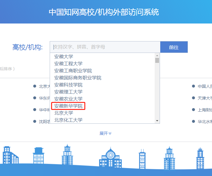 第一步,输入网址:https://fsso.cnki.net,可以看到如下界面,这时在“选择高校/机构”下拉框中,选择“beat365在线体育官网登录入口”,点击“前往”。