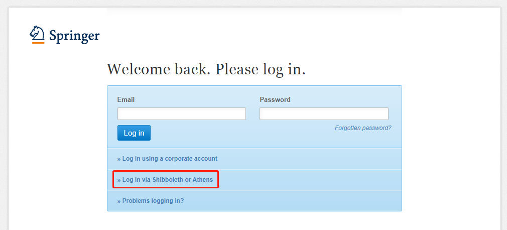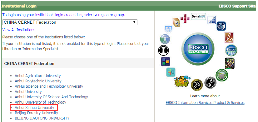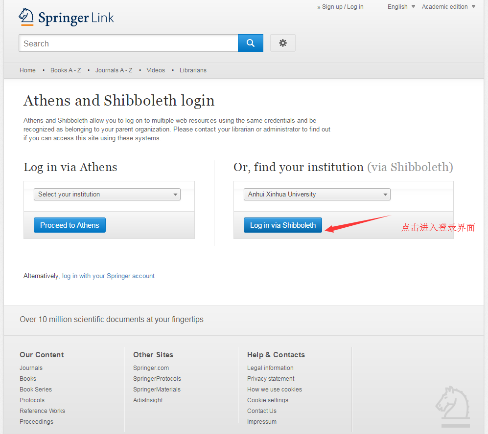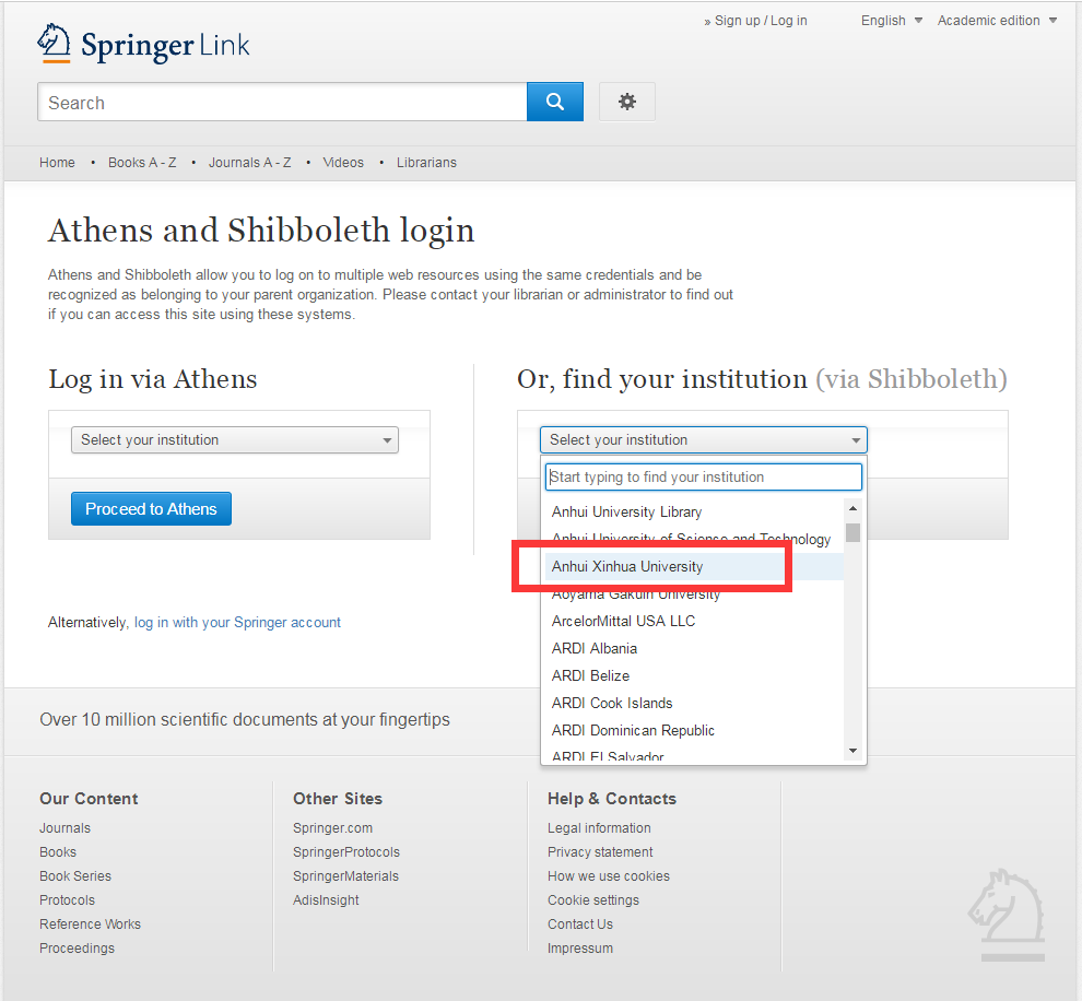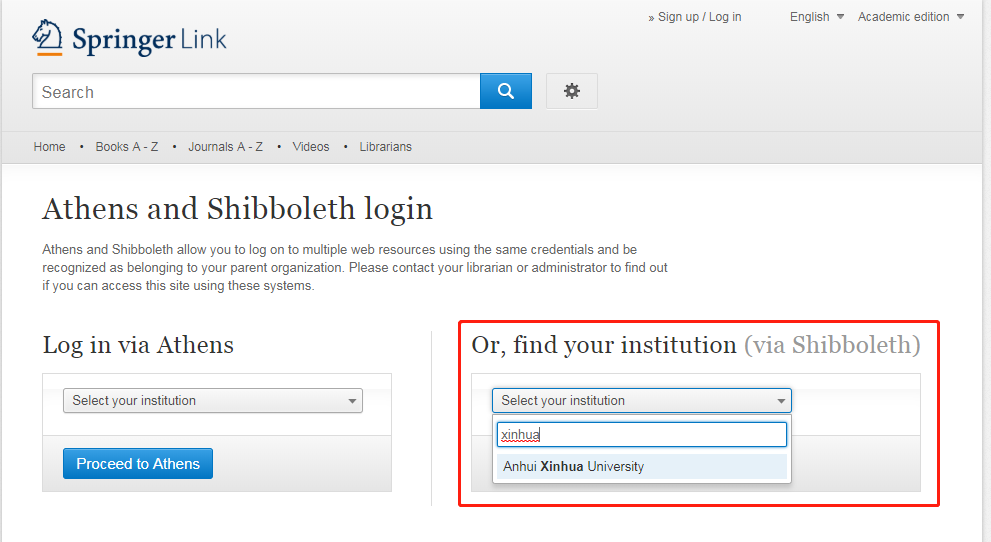 第二步,选择“Log in via Shibboleth or Athens”,在Log in via Shibboleth 上面的“Select your institution”输入“Anhui Xinhua University”或者选择本校的英文名称: