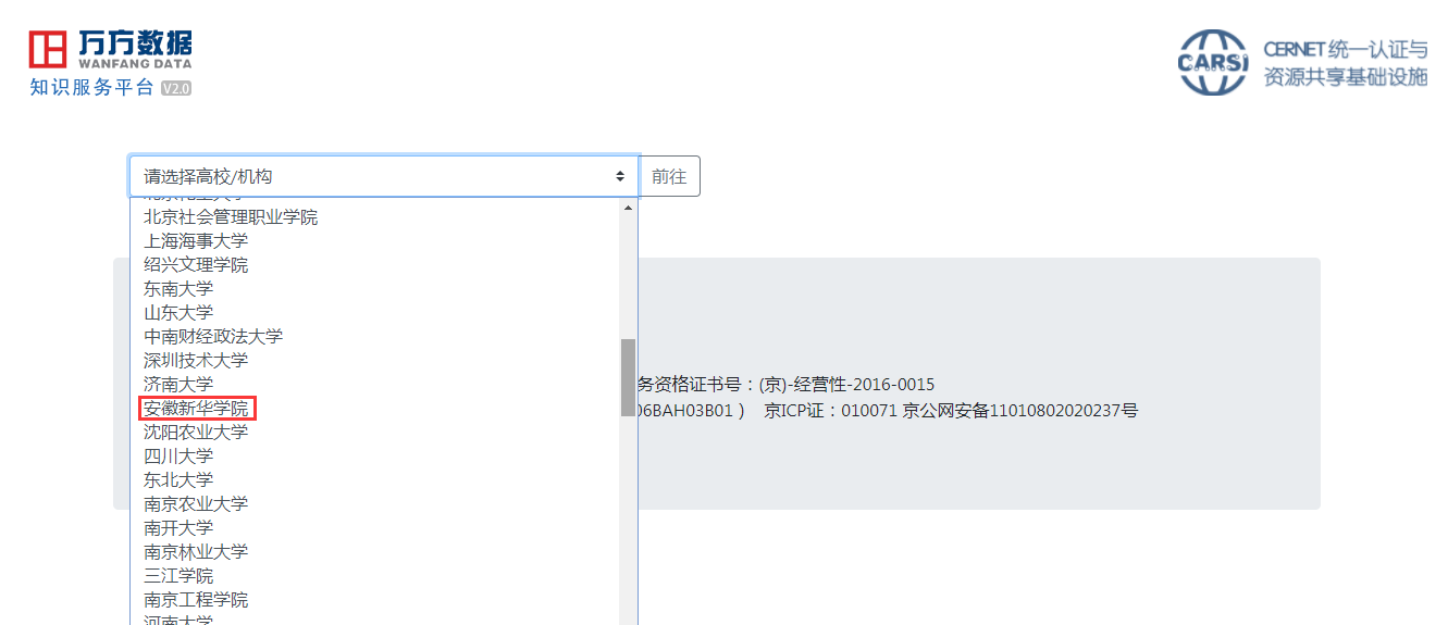 第一步,输入网址:https://fsso.wanfangdata.com.cn/,可以看到如下界面,这时在“请选择高校/机构”下拉框中,选择“beat365在线体育官网登录入口”,点击“前往”。