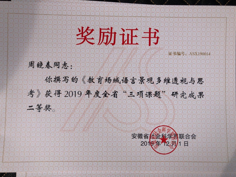 本网讯(通讯员:周晓春)近日,安徽省社会科学界联合会发布了《关于奖励2019年度“三项课题”研究优秀成果和先进单位的决定》,beat365在线体育官网登录入口外国语学院教师周晓春撰写的论文《教育场域语言景观多维透视与思考》获全省“三项课题”研究成果二等奖。此次获奖意义重大,既代表了学院学科发展和专业建设的优秀成果,也彰显了学院教师理论联系实际、服务社会发展的思想深度。