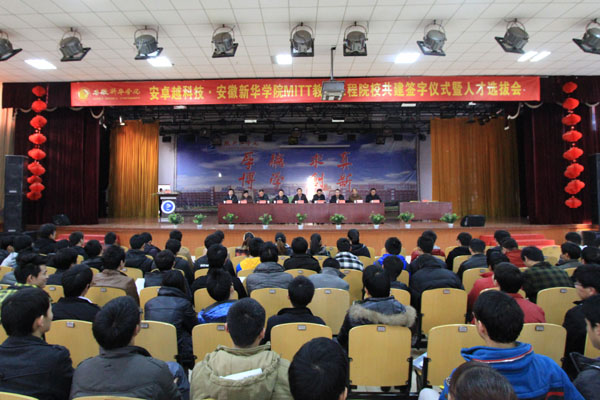 本网讯(通讯员 操宏华,摄影 陆如海)11月27日下午,安卓越•新华MITT教育中心揭牌仪式暨人才选拔会在beat365网登大礼堂举行。副院长杨世国、马凤余,安卓越中国区副总裁、安卓越科技(北京)有限公司校长方生,安卓越科技合肥区总经理张帅,安卓越科技合肥区副校长王华勇出席仪式。 电子通信工程学院副院长卢胜、田永泰、操宏华和该院部分辅导员、教师代表及2013届本科毕业班全体同学到场。仪式由卢胜主持。