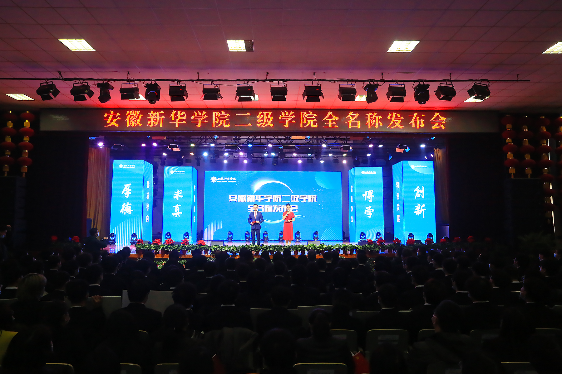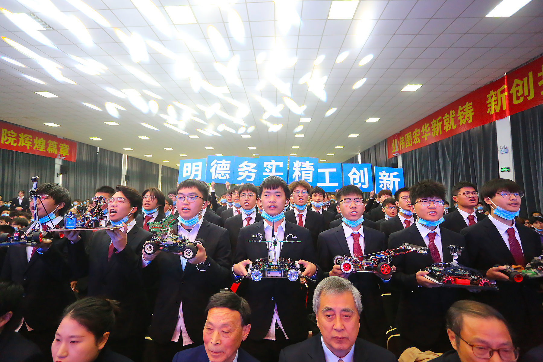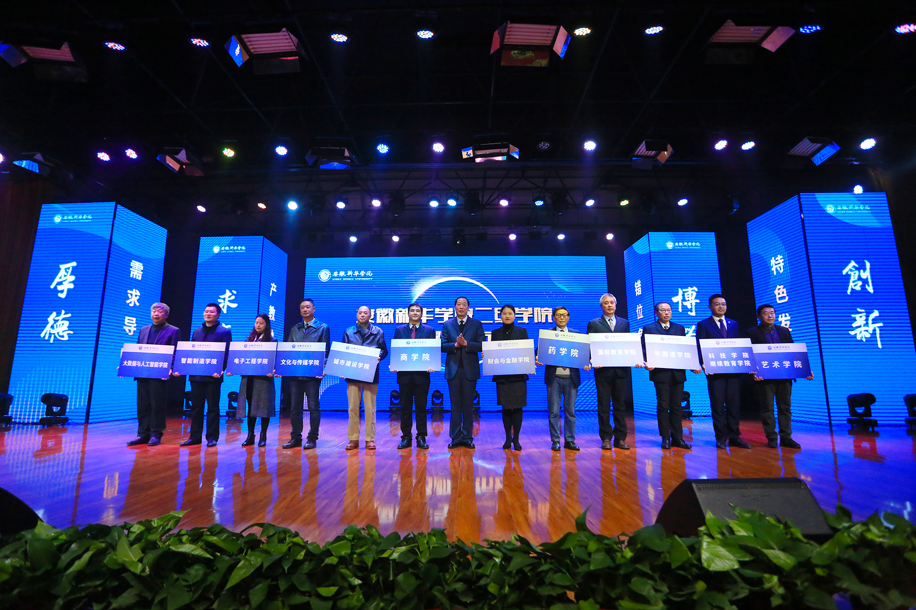 校执行董事储国定为12个二级学院授牌。随后,二级学院标识、院训正式亮相,各学院师生在台下铿锵有力地喊出他们的院训,现场热血沸腾!