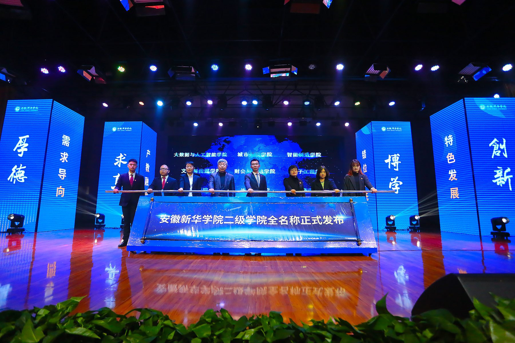 副校长方纯洁、大数据与人工智能学院院长吴建国教授、城市建设学院执行院长邵玲及优秀师生代表来到舞台中央,共同开启大屏,12个二级学院名称正式亮相,在场的全体师生一起见证了这一神圣时刻。