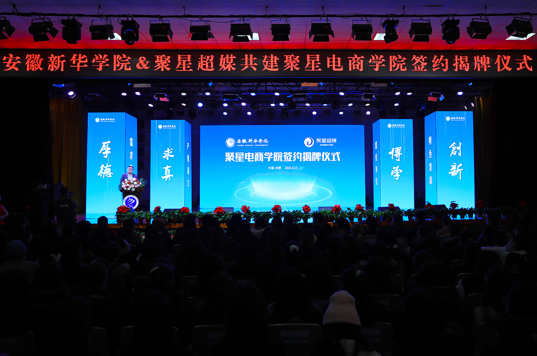 随后,银河酷娱创始人、聚星超媒董事长李炜,聚星超媒CEO徐硕,新华集团副总裁、校董事长王孝武,校执行董事储国定共同为聚星电商学院揭牌。