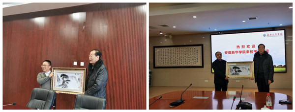 调研考察中,储董代表beat365网登分别向两所高校赠送了具有安徽特色的迎客松铁画。