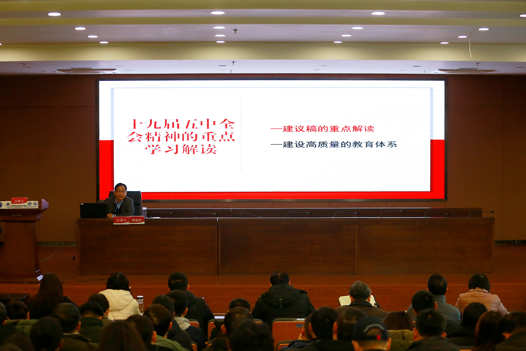 党的十九届五中全会是党在全面建成小康社会胜利在望、全面建设社会主义现代化国家新征程即将开启的重要历史时刻召开的一次具有开创性、里程碑意义的重要会议。全会通过的《中共中央关于制定国民经济和社会发展第十四个五年规划和2035年远景目标的建议》,明确了“十四五”时期经济社会发展的指导方针、主要目标、重点任务、重大举措,尤其是明确了“建设高质量教育体系”的政策导向和重点要求,是在新时代新起点上推动党和国家事业发展的纲领性文件。邸建伟的报告深入浅出、旁征博引,从深入学习贯彻党的十九届五中全会精神、高质量答好新时代高等教育考卷两个篇章,为参会师生作了一场精彩的专题报告。报告紧密联系我国2035年远景目标和“十四五”发展规划建议,解读了十九届五中全会精神的深刻内涵和核心要义、梳理概括了党的十八大以来习近平总书记关于教育的重要论述,解答了如何答好新时代高等教育考卷奋力谱写新篇章。邸建伟强调,要认真学习贯彻习近平总书记重要讲话和《建议》等文件,胸怀“两个大局”,充分认识十九届五中全会的重大意义,深刻理解十九届五中全会提出的一系列新的重要思想、重要论断、重大举措。 作为教育工作者,我们要坚持党的领导,坚持立德树人,服务国家战略,实现高质量发展,眼睛向内,练好内功,激发内在动力,发挥区域优势和学校特色;视野向外,把握好战略计划,适应新技术、新产业、新业态、新模式,坚持内涵建设,打造发展特色,创新引领发展。