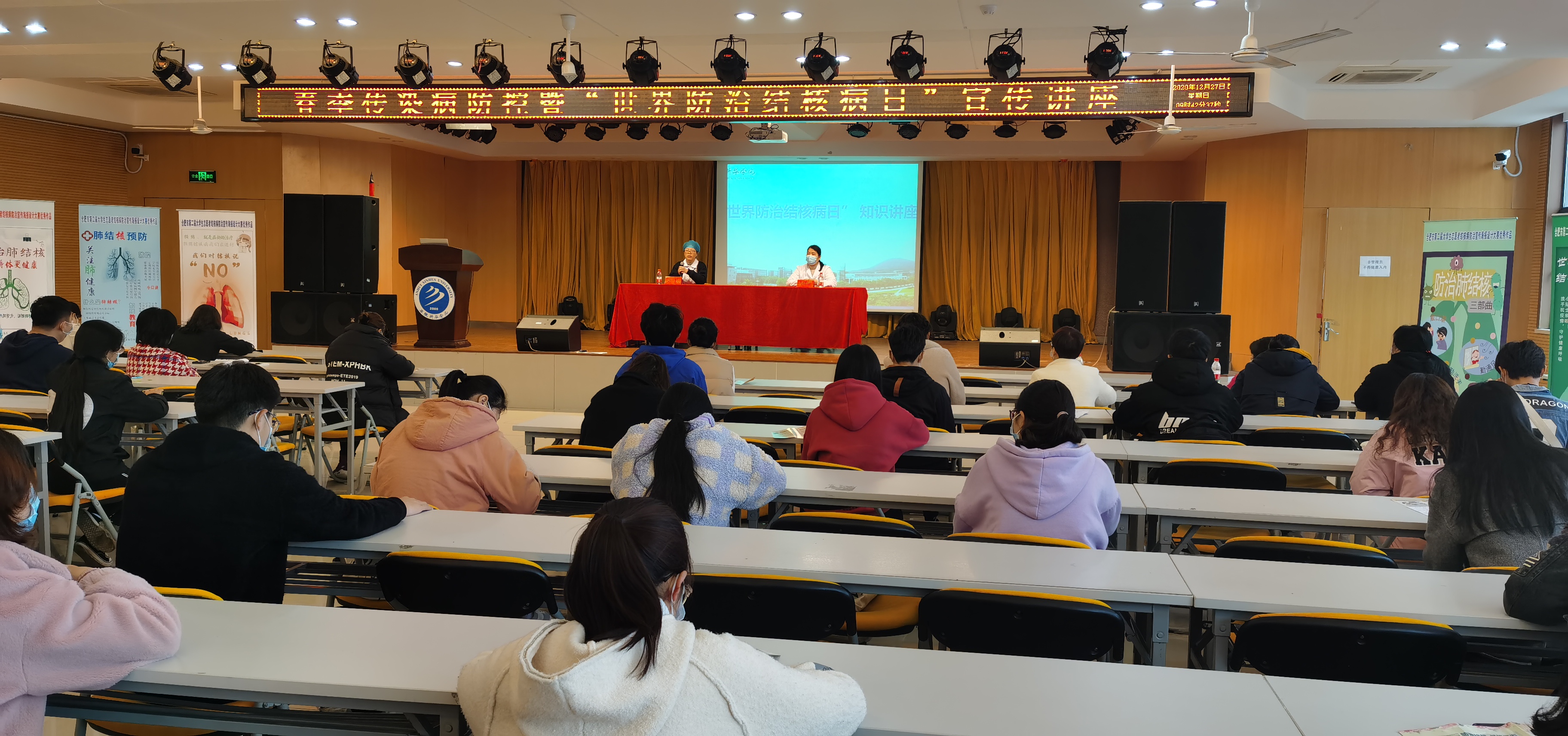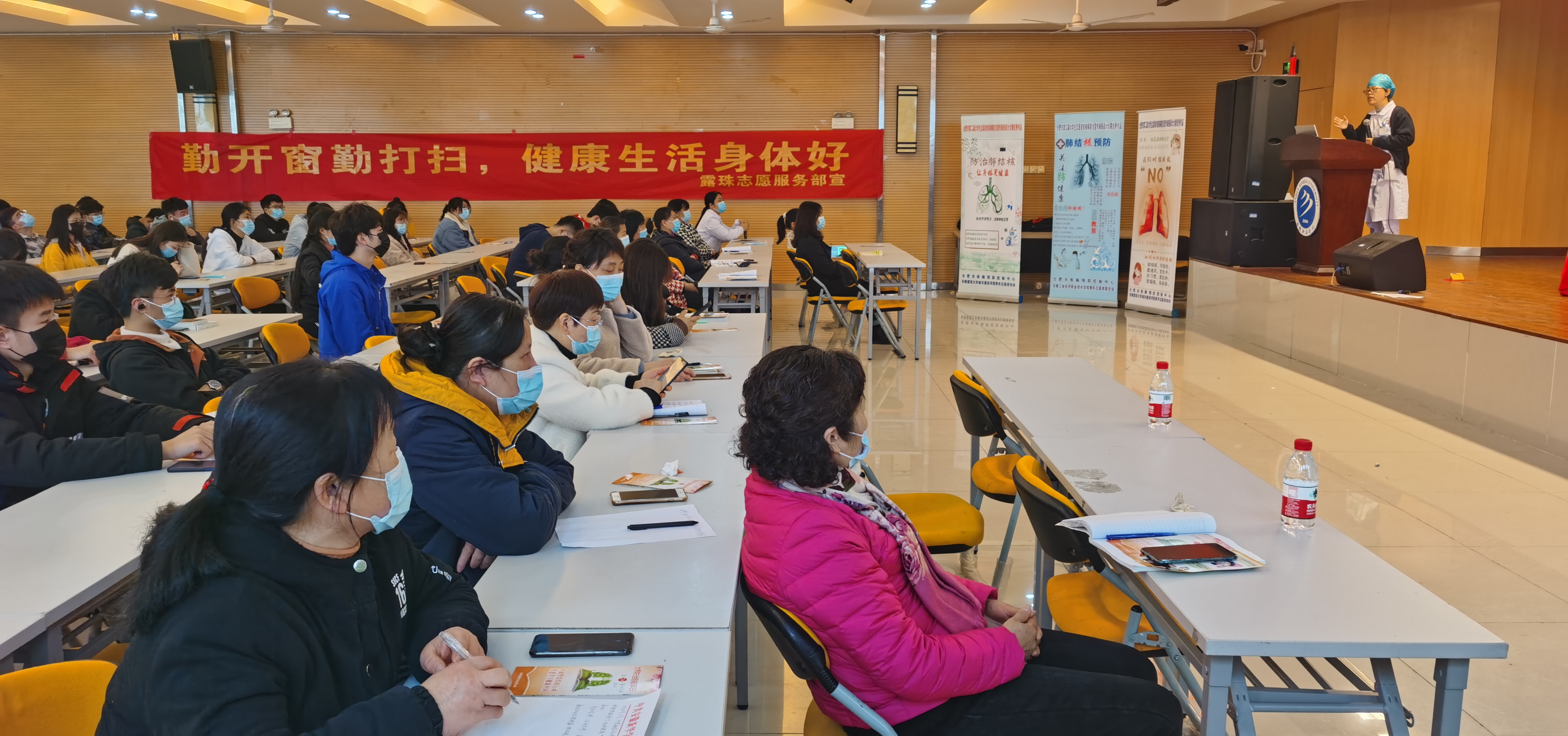 讲座中,刘珍用图文并茂的素材深入浅出地讲解了春季各类传染病的防控常识,重点介绍了肺结核的传播途径、常见症状及防治措施等相关知识,号召大家科学看待结核病患者,结核病是可防、可控、可治的。随后,马晓丽医生详细介绍了校园春季传染病防控的重要性,她强调在春季传染病防控工作中,预防意识是关键,建议大家养成“勤洗手、多喝水、勤通风、加强锻炼、合理作息”的良好卫生生活习惯和健康生活方式。讲座最后向学生们发放了《肺结核预防》知识宣传册并就现场学生们提出的问题进行了互动解答。