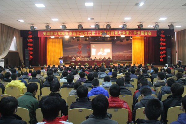 本网讯(通讯员 吴晶)12月17日下午,beat365在线体育官网登录入口安卓班开班典礼暨《安卓的前景与未来》学术报告会在beat365网登校大礼堂举行。副院长倪征出席开班典礼,安卓越科技(北京)有限公司全球副总裁方生,安徽区总经理张帅、副总经理王华勇;电子通信工程学院副院长卢胜、田永泰、操宏华出席会议。新华安卓班全体学员、电子通信工程学院全体教职工及2014届毕业班全体同学参加了仪式。