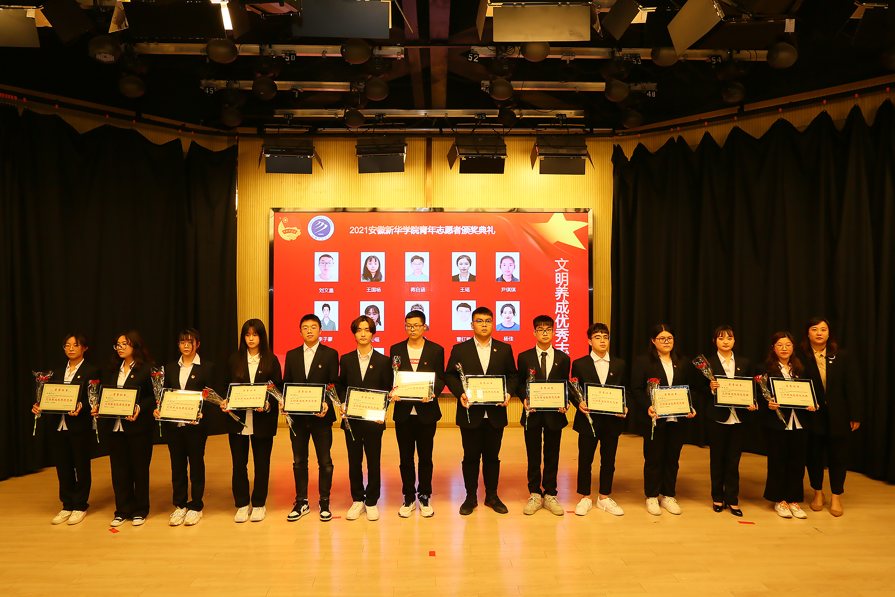 第一篇章表彰了“疫情防控优秀志愿者”、“文明养成优秀志愿者”。学生处/团委处长助理计羚、学生处副处长郑妮分别为获奖学生颁奖。