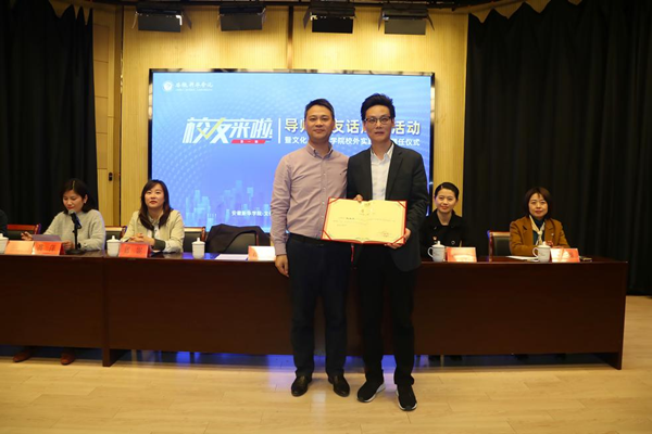 随后,汪俊东颁发校外实践导师聘书,向校友的到来表示欢迎,对校友在工作中所取得的优异成绩表示祝贺,同时希望赵成龙今后作为校外实践导师能够为母校和文化与传媒学院的发展提供更多的支持与帮助。同时也肯定了文化与传媒学院和校友办举办本次活动的重要意义。校友是母校的名片,每一位校友的业绩都是母校的骄傲,同时校友也是母校建设与发展中一支值得信赖且可以依靠的重要力量。近年来,学校越来越重视校友工作,于今年正式成立校友工作办公室,统筹规划校友工作,期待校友办能联合各二阶学院开展形式多样的校友活动,搭建全方位、多层次的校友工作服务平台,更好地助力校友事业与学校事业的共同发展。